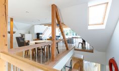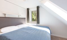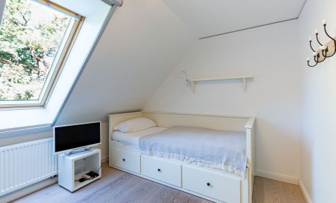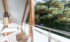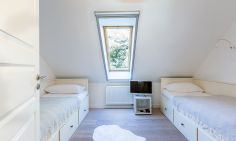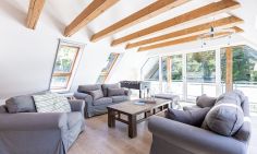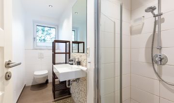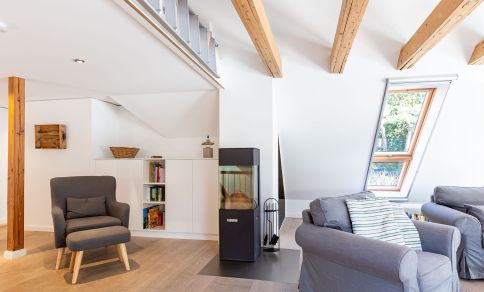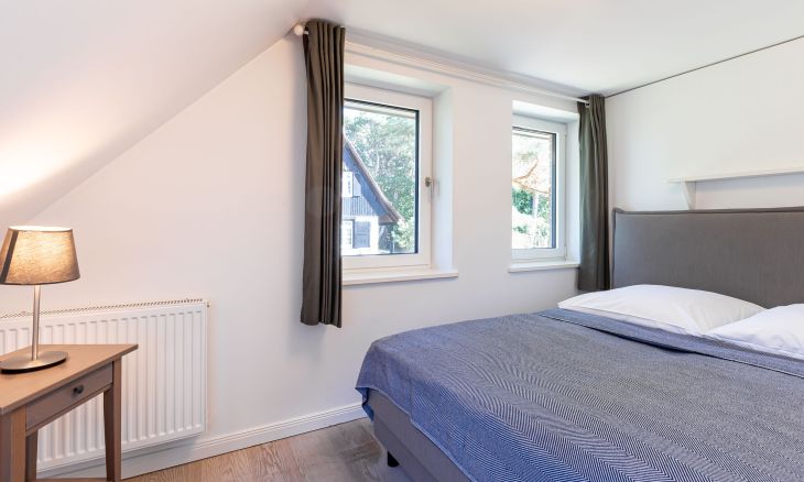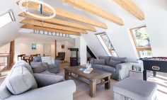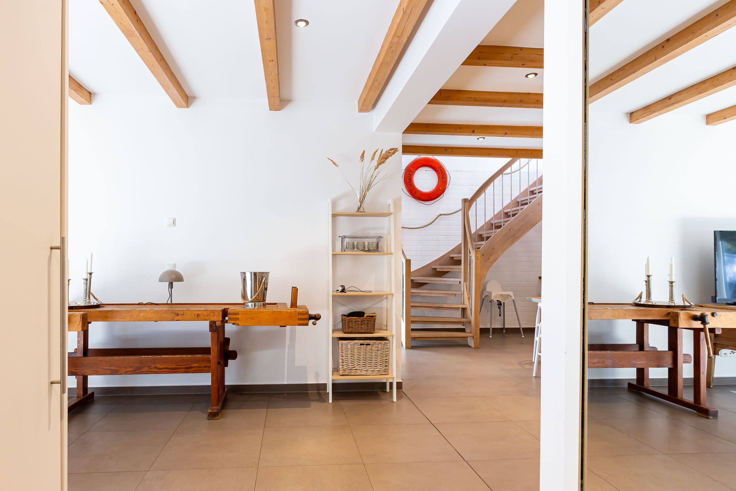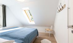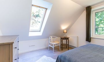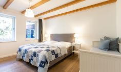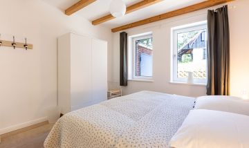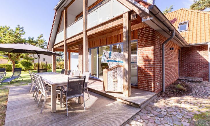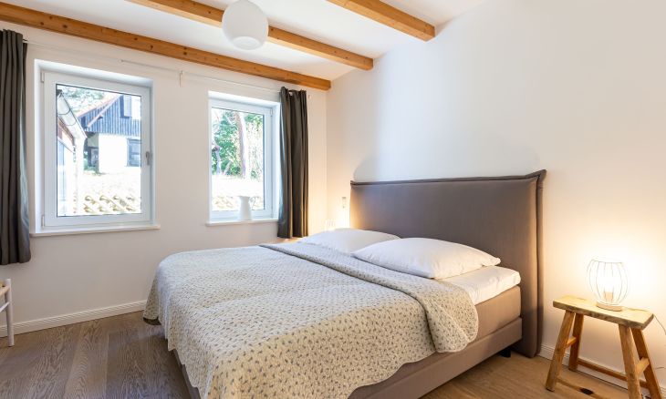Im Erdgeschoss erwartet dich neben dem Eingangsbereich mit Garderobe der großzügig kombinierte Wohn- und Küchenbereich. Auf der linken Seite empfängt dich eine gemütliche Sitzecke mit direktem Ausblick in den Garten. Im anderen Teil des Wohnbereichs fügt sich der große und einladende Esstisch ein. Dieser bietet seinen Gästen ausreichend Platz für gesellige Stunden - ob beim Spieleabend oder beim gemeinsamen Essen. Die angrenzende Einbauküche begeistert mit klarer Formgebung und einer ausgezeichneten Ausstattung, die das Herz aller Kochbegeisterten höher schlagen lässt. Im Erdgeschoss befinden sich außerdem zwei Schlafzimmer, die mit je einem Doppelbett ausgestattet sind. In einem der beiden Schlafzimmer bietet zudem ein Kojenbett eine zusätzliche Aufbettungsmöglichkeit. Für weiteren Wohnkomfort sorgen zwei Badezimmer mit Dusche/WC auf der unteren Etage. Das Obergeschoss mit Galeriecharakter dient mit vierzig Quadratmetern als zweiter großzügiger Wohnbereich. Hier befinden sich eine gemütliche Sitzecke am Kaminofen, ein Spieltisch, ein Kicker sowie eine kleine Kinderspielecke. Du kannst von hier aus auch auf den überdachten Balkon mit Blick in den Garten gelangen. Bei der Einrichtung des Hauses ist man auf viele Gästewünsche eingegangen und hat so die Grundlage für einen vielseitigen und erholsamen Urlaub geschaffen. Das Obergeschoss beinhaltet noch insgesamt drei weitere Schlafzimmer mit zwei Doppelbetten und zwei Einzelbetten. Im Obergeschoss gibt es ein drittes Badezimmer mit Whirlwanne und Dusche/WC.