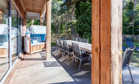 Zum Ferienhaus gehört ein traumhafter und eingezäunter Naturgarten. Die umlaufenden Holzterrassen sind teilweise überdacht, hochwertig möbliert und und bieten dir mehrere Sitzmöglichkeiten. Sonnenliegen sowie ein Kugelgrill gehören ebenfalls dazu. Ruhe, Erholung und leckeren Grillabenden steht also nichts mehr im Wege. Hier gelangst du auch zum separaten Saunahäuschen, dass mit Ruheliegen, einer Dusche und der Sauna ausgestattet ist. Diese kleine Wellnessoase kann separat gegen eine Gebühr dazu gebucht werden. Für Spaß und Action steht dir ab sofort auch eine Outdoor-Tischtennisplatte zur Verfügung. Es gehören zwei bis drei PKW-Stellplätze zum Haus.