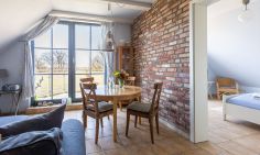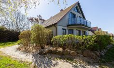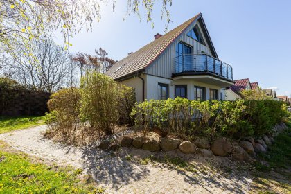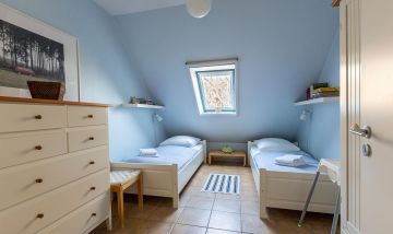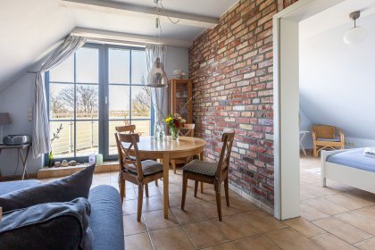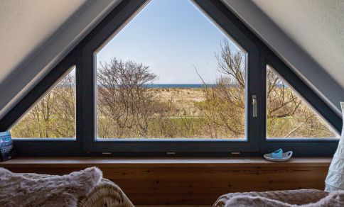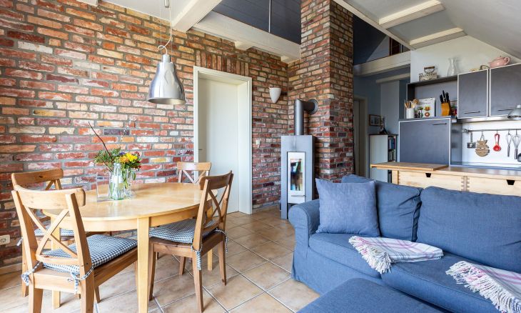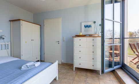 Die gemütliche Ferienwohnung befindet sich im Obergeschoss des Strandhauses und begeistert mit einer tollen Raumaufteilung und Highlights wie der Lesegalerie mit Relaxliegen und Blick auf das Ostseepanorama. Mittelpunkt der Wohnung ist der offene Wohn- und Küchenbereich mit Kamin und Zutritt zum Balkon. Das gemütliche Sofa, der sonnige Essbereich und die großen Fensterfronten mit Blick in die Natur sorgen für eine herrliche Urlaubsatmosphäre und bieten den perfekten Rückzugsort nach einem ausgiebigen Strandtag. Über eine Leiter gelangt man auf die Empore. Mit den Entspannungsliegen und dem Ausblick findet man hier einen zusätzlichen Ruheraum. Das Hauptschlafzimmer befindet sich gleich nebenan und verfügt neben einem Doppelbett und ausreichend Stauraum für die Kleidung ebenfalls über einen Zugang zum Balkon. Ein zweites Schlafzimmer ist mit zwei Einzelbetten ausgestattet, das sich hervorragend als Kinderzimmer eignet. Abgerundet wird die Wohnung durch ein Tageslichtbad mit Dusche, Fön und Handtuchhalter.