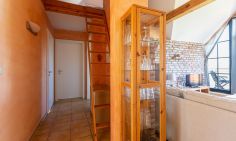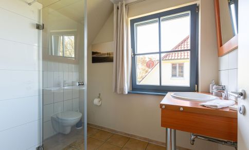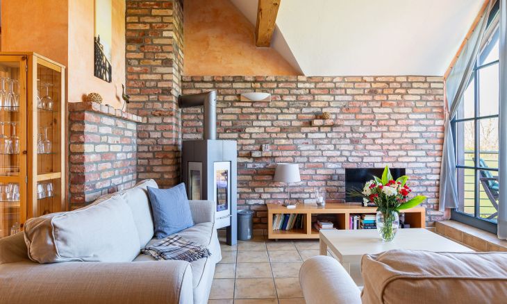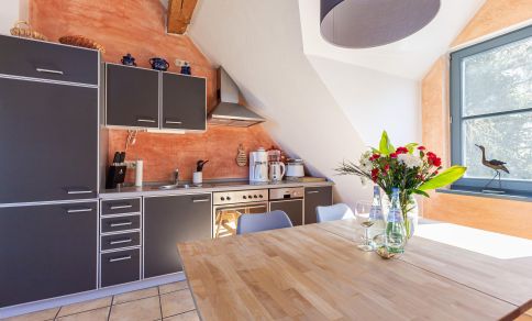 Diese heimelige Maisonette-Wohnung befindet sich im ersten Stock des Strandhauses und garantiert einen traumhaften Blick über den Deich auf der Westseite und auf den Bodden zur Ostseite. Das Herzstück der Wohnung ist der offen gestaltetet Wohn- und Küchenbereich, der mit seinem freigelegten Holzbalken, dem Kamin und der gemauerten Ziegelwand eine dekorative und urgemütliche Wohnatmosphäre schafft. Zur Wohnung gehört eine top ausgestattete Küchenzeile mit Esstisch und Blick auf die überfluteten Fischlandwiesen. Ruhe und Erholung findest du auch im Hauptschlafzimmer, das mit einem Doppelbett und Kleiderschrank ausgestattet ist. Wie von jedem Punkt der Wohnung genießt du auch hier einen fantastischen Blick in die Natur. Ein weiterer Schlafbereich befindet sich im offenen Spitzboden über dem Wohnraum und ist über eine steile Holztreppe begehbar. Vervollständigt wird die Wohnung durch ein modernes Tageslichtbad mit ebenerdiger Dusche.