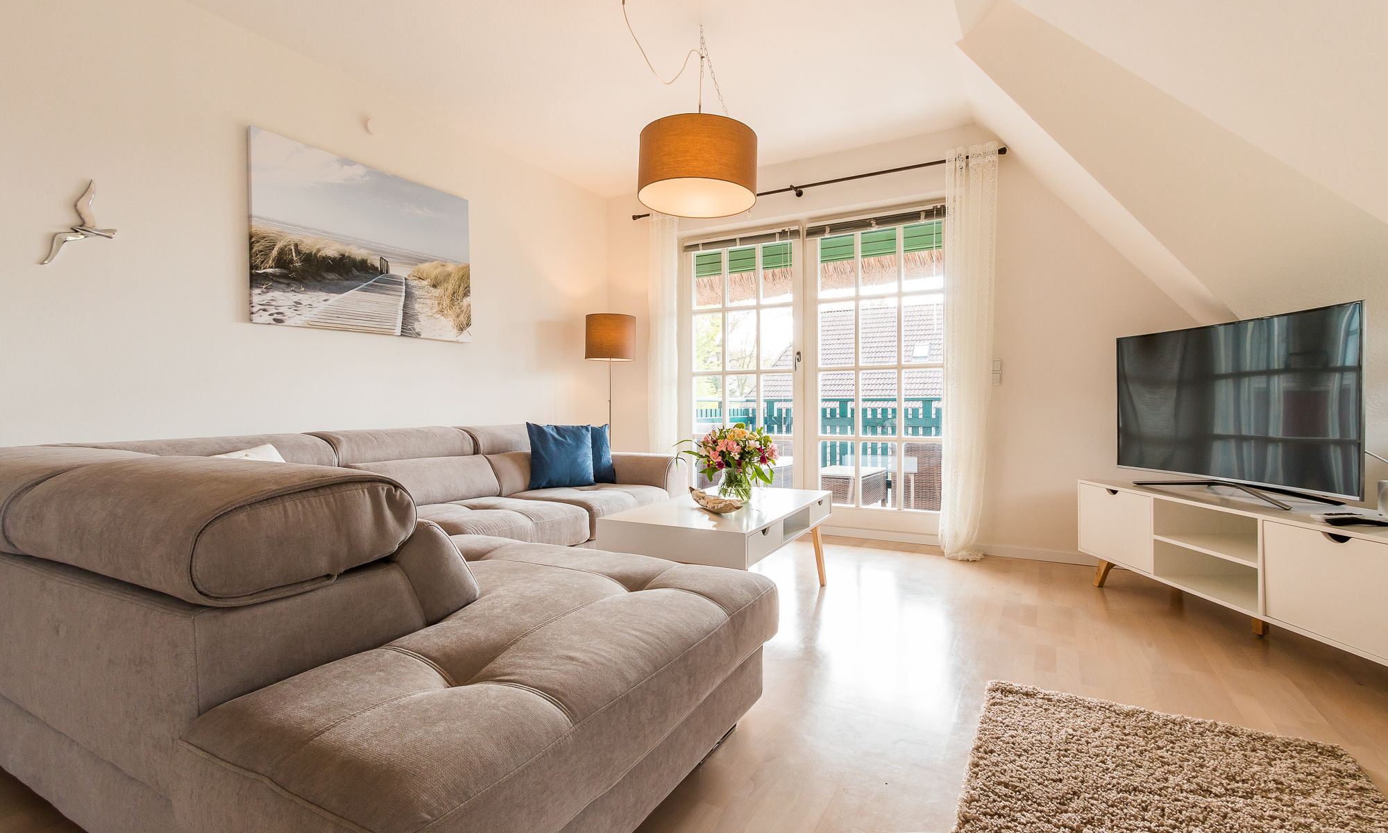 Im Obergeschoss erwartet dich ein großzügiger Wohnraum mit einer komfortablen Sitzecke. Die Einbauküche ist komplett ausgestattet, sogar eine Tassimo-Kaffeemaschine steht bereit. Küche und Essbereich schließen sich dem Wohnbereich an. Genieße die Sonnenuntergänge über der Ostsee auf einem der Balkone bei einem guten Glas Wein. Du kannst wählen, ob du den Balkon in Nord-West-Ausrichtung (vom Küchenbereich begehbar) nutzen möchtest oder auf dem Balkon in Süd-West-Lage einen geselligen Grillabend (nur mit dem vorhandenen Elektrogrill) genießt. Die zwei Schlafzimmer sind jeweils mit einem Boxspringbett und einem TV ausgestattet. Hier kannst den Tag Revue passieren lassen und dich traumhaft betten. Das Tageslichtbad wurde neu modernisiert und ist mit einer Badewanne, Dusche/WC und einem Handtuchtrockner ausgestattet.