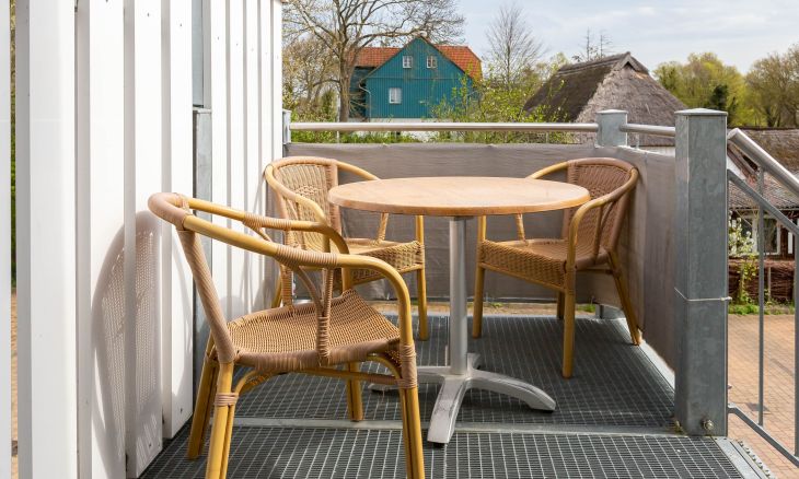 An der Treppe zum Wohnungseingang steht dir eine Sitzgelegenheit mit Tisch und Stühlen für den ersten Kaffee am Morgen zur Verfügung.