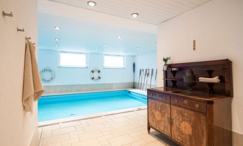 Das Schwimmbad befindet sich im Haus 2 und die Wohnung in Haus 1. Zur Nutzung musst du das Haus 1 verlassen, um ins Haus 2 zu gelangen. Das Schwimmbecken hat die Maße 4,0 x 7,5 Meter und ist etwa 1,40 Meter tief.