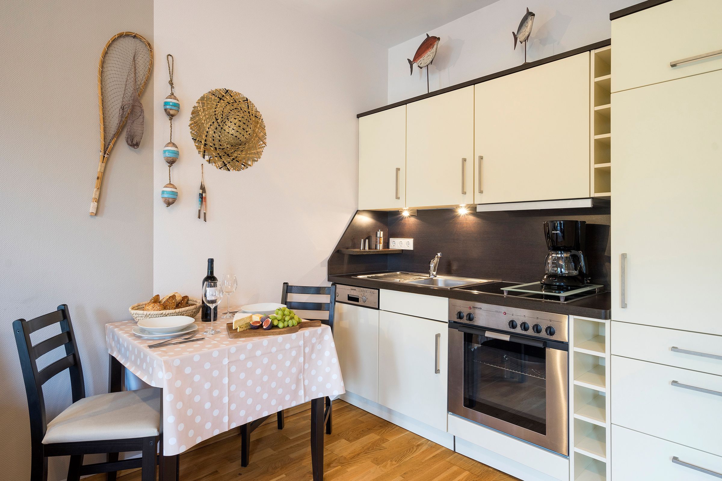 Die Wohnung ist gut ausgestattet. Küchengeschirr und Besteck könnten besser sein und sollten zumindest ergänzt werden. Die Lage zum Strand ist sehr gut. Die Bereitstellung oder Reservierung eines Strandkorbes bei der Anmietung wäre wünschenswert. Die Parkplätze am Haus sind okay. Die sichere Unterbringung von Fahrrädern fehlt leider. Die Terrasse der Wohnung 5 war nicht gut. Der Tisch war defekt und Stühle waren unzureichend mit Sitzkissen ausgestattet. Ansonsten kommen wir immer wieder gern in diese Wohnung und freuen uns auf unseren Urlaub in dieser Wohnung im nächsten Jahr. Wir sind mittlerweile so etwas wie Dauergäste und kommen seit Jahren in dieses Haus und diese Wohnung.