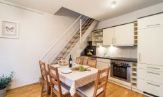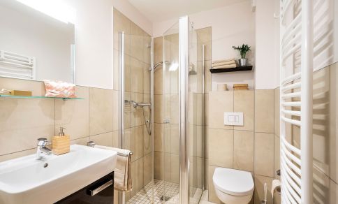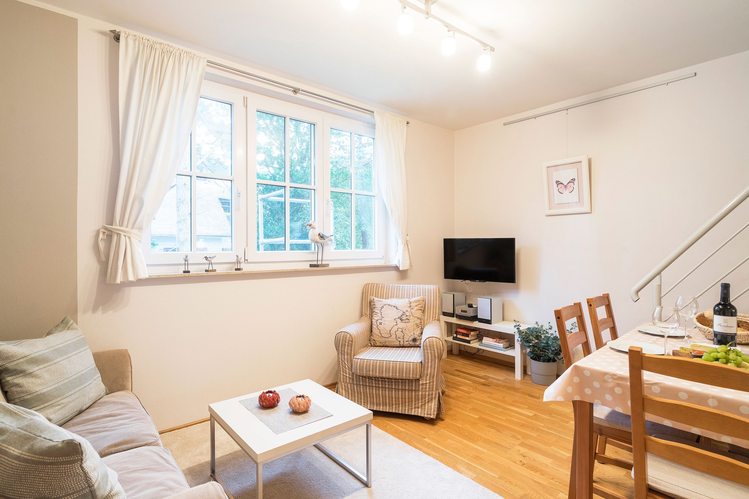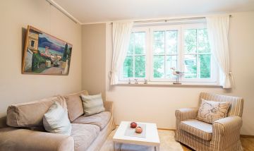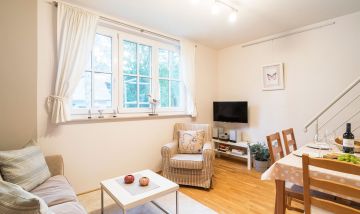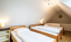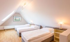 Im Obergeschoss befinden sich der Wohnbereich mit gemütlicher Sitz- und Essecke, eine separate Küchenzeile, ein Schlafzimmer mit Doppelbett (180x200 cm) und ein Bad mit Dusche/WC. Das Dachgeschoss verfügt über ein offenes zweites Schlafzimmer mit drei Einzelbetten. Vom Schlafzimmer hast du einen kleinen Ausblick auf die Ostsee. Im Preis inklusive ist die Nutzung des Wellnessbereiches im Untergeschoss. Hier befinden sich ein Schwimmbad, eine Saunalandschaft, ein Ruheraum sowie Kneippfußbäder und Massageduschen.