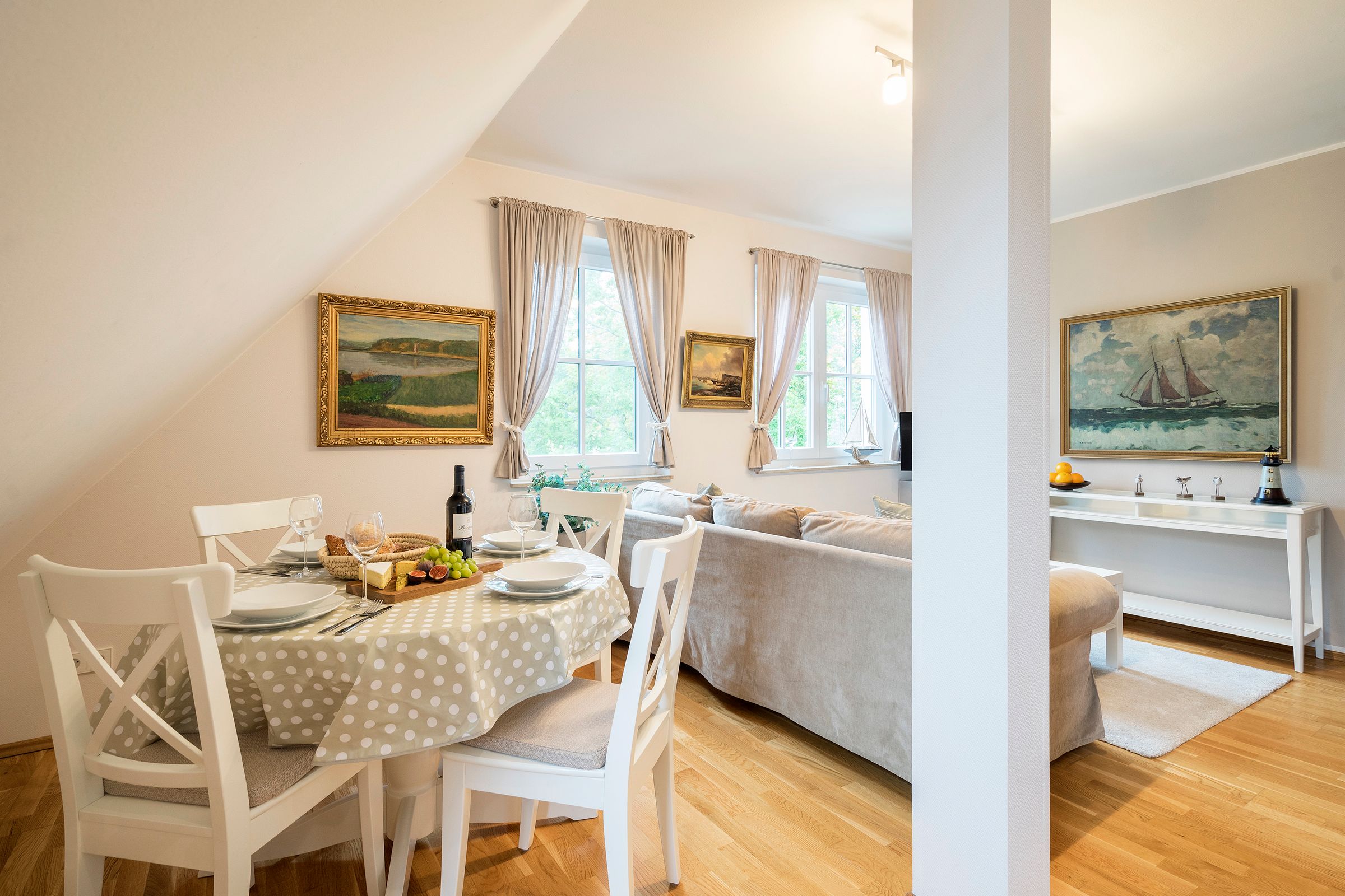 Die Hausanlage mit zwölf Ferienwohnungen liegt nur 150 Meter vom weißen Ostseestrand entfernt und befindet sich direkt an der Bäderstraße L21. Neben der strandnahen Lage ist auch der Ortskern mit Bäckereien und einer Vielzahl von Restaurants, Cafés und Kunstgalerien nur ca. einen Kilometer entfernt. Der angrenzende Deich eignet sich perfekt für Wanderungen oder Radtouren in den Nationalpark, zum Weststrand und entlang der weiten Boddenlandschaft.
