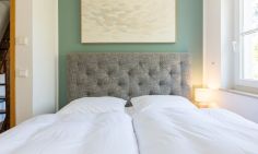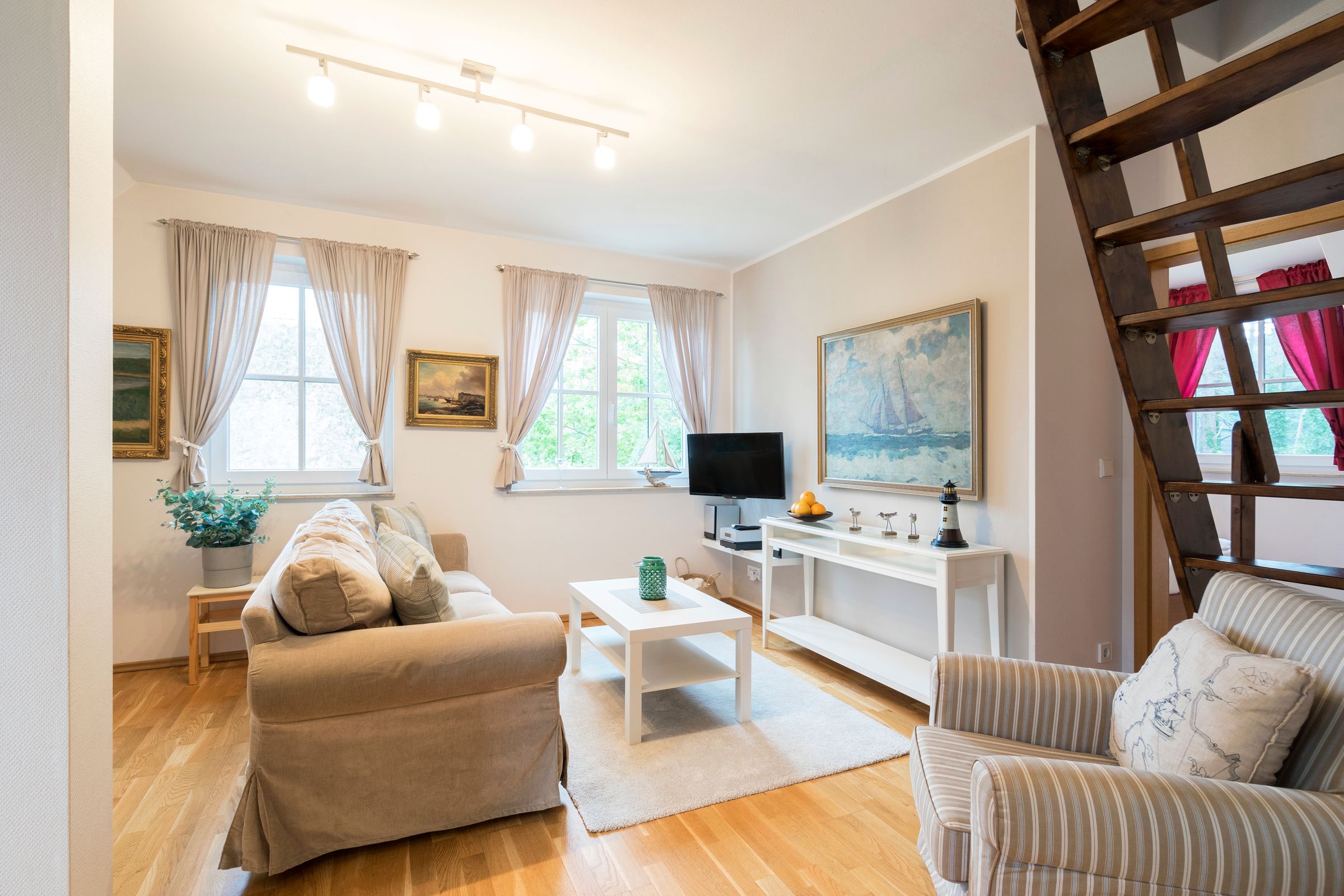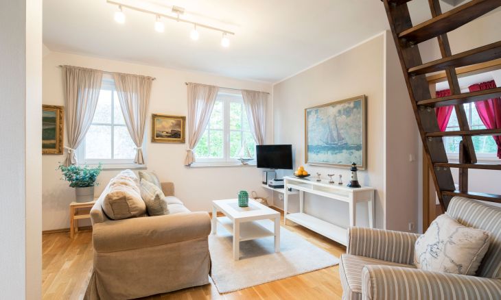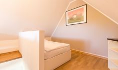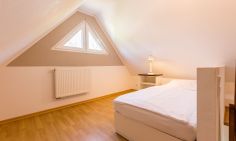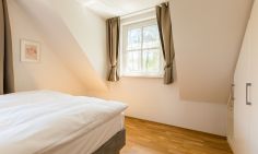 Im Obergeschoss befinden sich der Wohnbereich mit gemütlicher Sitz- und Essecke, eine offene Küchenzeile, ein Schlafzimmer mit Doppelbett (180x200 cm) und ein Bad mit Dusche/WC. Das Dachgeschoss verfügt über ein offenes zweites Schlafzimmer mit zwei Einzelbetten. Von hier hast du einen kleinen Ausblick auf die Ostsee. Im Preis inklusive ist die Nutzung des Wellnessbereiches im Untergeschoss. Hier befinden sich ein Schwimmbad, eine Saunalandschaft, ein Ruheraum sowie Kneippfußbäder und Massageduschen.