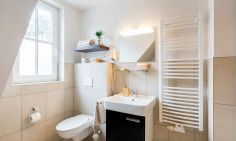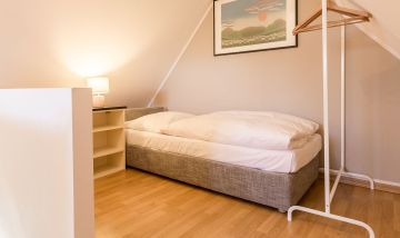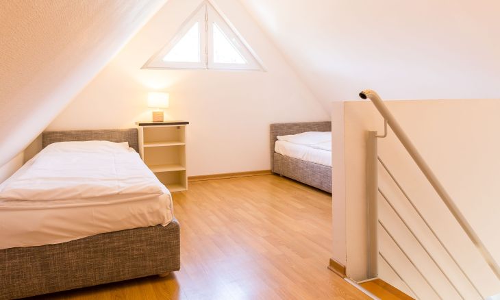 Im Obergeschoss befinden sich der Wohnbereich mit gemütlicher Sitz- und Essecke, eine offene Küchenzeile, ein Schlafzimmer mit Doppelbett (180x200 cm) und ein Bad mit Dusche/WC. Das Dachgeschoss verfügt über ein offenes zweites Schlafzimmer mit drei Einzelbetten. Von hier hast du einen kleinen Ausblick auf die Ostsee. Im Preis inklusive ist die Nutzung des Wellnessbereiches im Untergeschoss. Hier befinden sich ein Schwimmbad, eine Saunalandschaft, ein Ruheraum sowie Kneippfußbäder und Massageduschen.