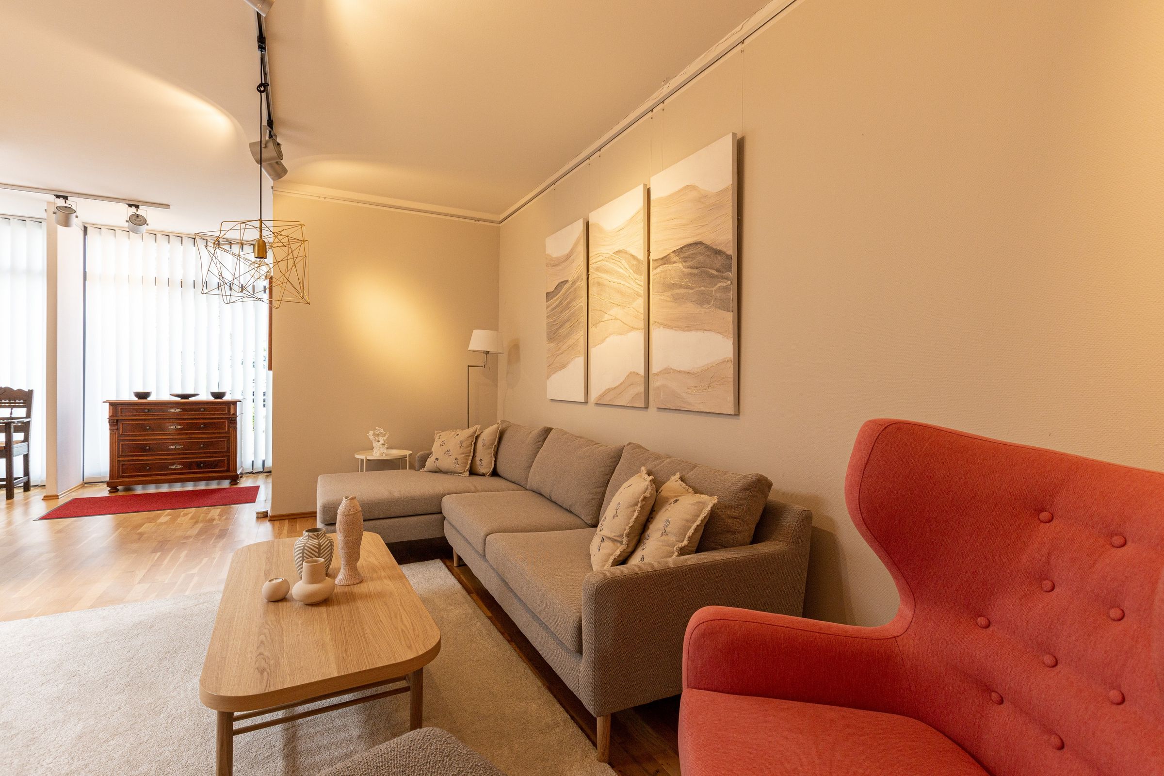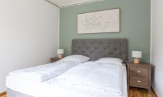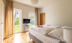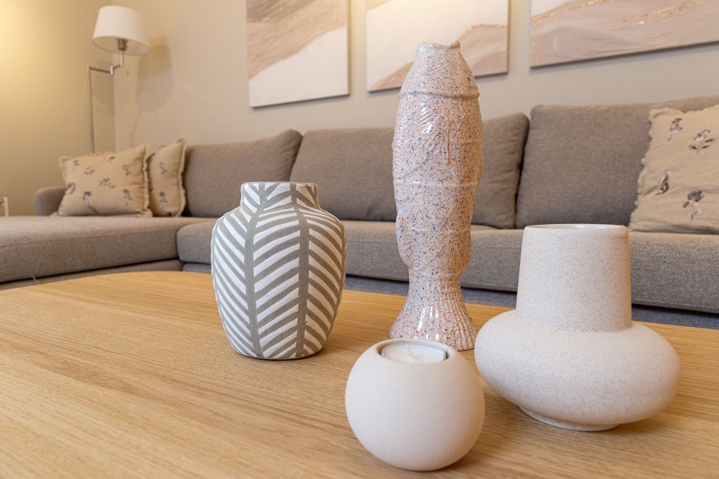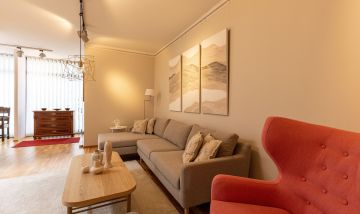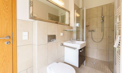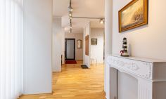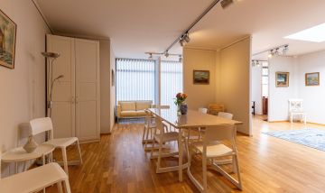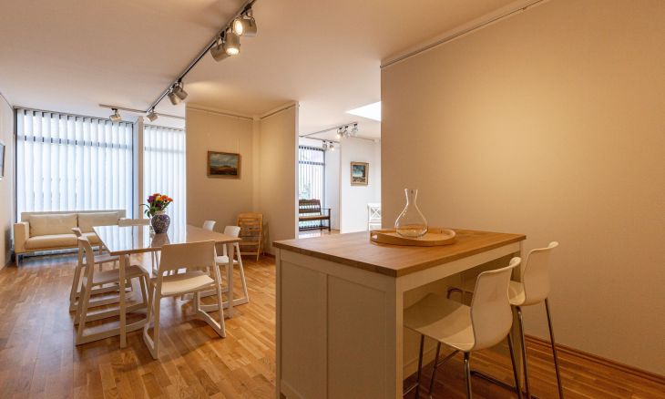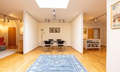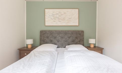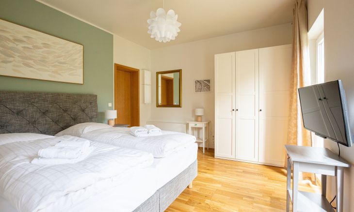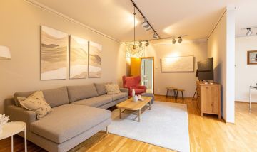 Die Galeriewohnung wurde in 2022 aufwendig renoviert. Entstanden ist eine 120 Quadratmeter große Ferienwohnung, die dank der besonderen Raumaufteilung und stillvollen Einrichtung einen wundervollen Urlaub garantiert. Schon mit Eintritt in die Wohnung begeistert die Freizügigkeit, die den Wohn- und Essbereich umgibt. Im hellen freundlichen Skandi-Stil eingerichtet, erinnern nur noch die Ölgemälde an den Wänden an die einstige Kunstgalerie des Hauses. Während der vordere Teil mit Sofalandschaft und TV für die erholsamen Urlaubsstunden steht, befindet sich im hinteren Teil der moderne Esstisch mit Küchentresen und Zugang zur gut ausgestatteten Küchenzeile. (Hinweis: Die auf den Bildern abgebildete Siebträgermaschine gehört nicht zur Ausstattung! Es ist eine handelsübliche Kaffeemaschine vorhanden.) Die beiden Schlafzimmer sind mit hochwertigen Boxspringbetten, TV und Kleiderschrank ausgestattet. Getrennt werden sie durch das Tageslichtbad, mit Dusche, WC und Handtuchhalter, dass von beiden Räumen zu begehen ist.