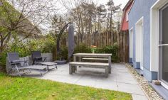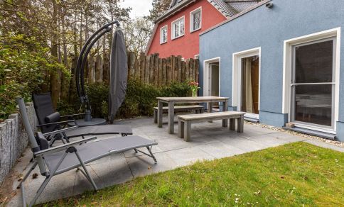 Im Außenbereich befindet sich die großzügige Terrasse der Wohnung. Dank der Lage und ostseetypischen Holzbohlen als Sichtschutz genießt du hier die Privatsphäre, die man sich im Urlaub wünscht. Sonnenliegen, Holzbestuhlung und ein großer Sonnenschirm runden den Komfort der Terrasse perfekt ab. Es gehört zudem ein PKW-Stellplatz zur Ferienwohnung.