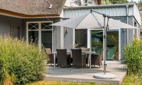Im Außenbereich erwartet dich ein kleiner gepflegter Garten. Mit der großzügigen Holzterrasse, der hochwertigen Bestuhlung und den Sonnenliegen kannst du deinen Urlaub auch draußen genießen. Zum Ferienhaus gehören zwei PKW-Stellplätze.