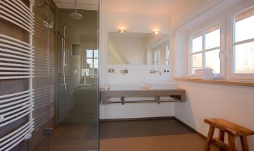 Du gelangst über den abgeschlossenen Eingangsbereich mit Garderobe direkt in den offenen und lichtdurchfluteten Wohnbereich. Hier erwartet dich eine gemütliche Sitzecke am modernen Kamin. Ein großzügiger Essbereich und die hochwertige Einbauküche mit Kochinsel und Tresen sind perfekt aufeinander abgestimmt und fügen sich harmonisch in das Gesamtbild ein. Auch ein Gästebad mit Dusche/WC befindet sich im Erdgeschoss. Das Obergeschoss beherbergt ein Schlafzimmer mit einem Doppelbett sowie ein luxuriöses Bad mit Badewanne, Dusche/WC. Der Spitzboden bietet ein zusätzliches Geschoss, das als offene Schlafgalerie mit zwei Einzelbetten ausgestattet ist. Im Anbau des Hauses wurde eine Wellnessoase geschaffen, die sich über zwei Ebenen erstreckt und von beiden Haushälften genutzt werden kann. Dank der Sauna, Dusche und dem Ruhebereich mit Entspannungsliegen kannst du hier nach Herzenslust relaxen, neue Energie tanken und einfach nur die Seele baumeln lassen.