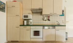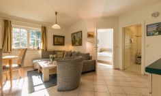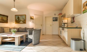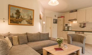 Die Wohnung befindet sich im Erdgeschoss. Über eine eigene, separate Diele gelangt man in den großen hellen Wohnraum mit einer gemütlichen Sitzecke, einem Essplatz und einer integrierten Küchenzeile. Das helle Bad verfügt über Dusche / WC. Das Schlafzimmer ist mit einem Doppelbett und einem zweiten TV ausgestattet. Die Couch im Wohnbereich ist ausziehbar und bietet eine zusätzliche Aufbettung für eine Person.