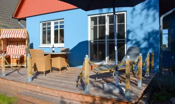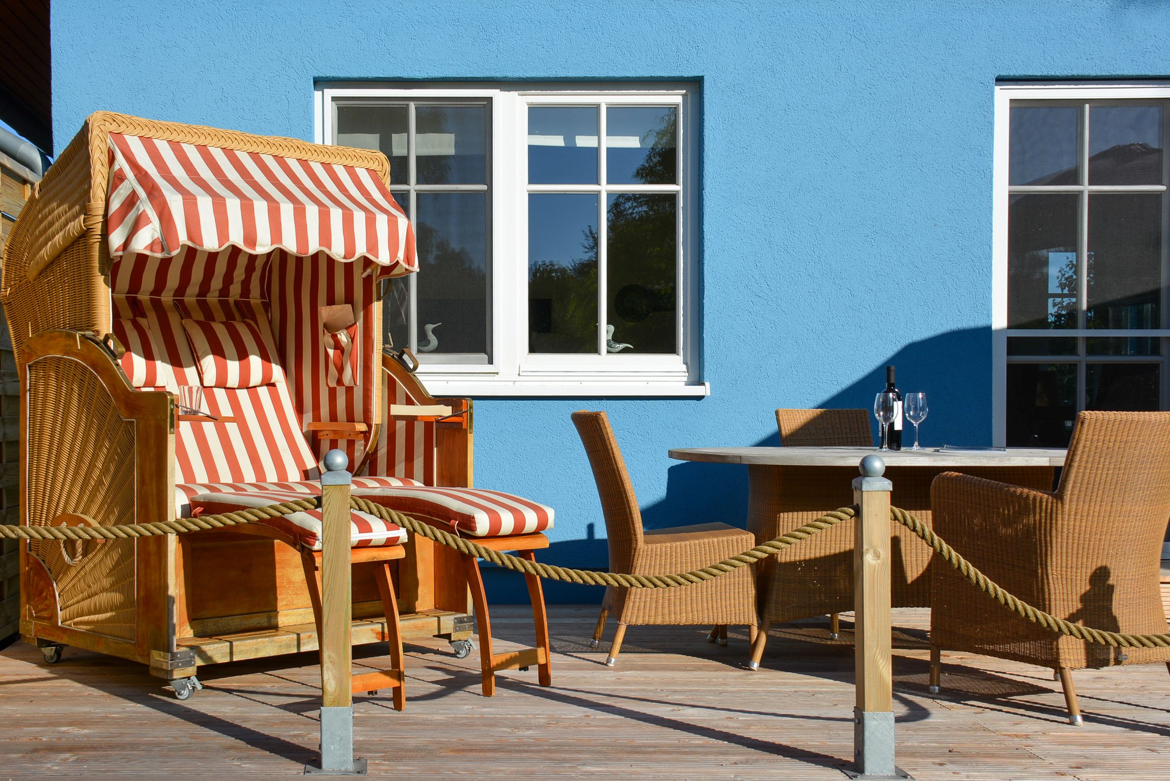 Der Außenbereich begeistert mit einem sehr idyllischen Garten und einer Terrasse mit Sonnenliegen (in den Sommermonaten). Hier genießt du ganz viel Privatsphäre, Ruhe und Erholung, denn neben Haus Wieckend steht ganz Wieck für einen besonderen Urlaub zwischen Ostsee und Bodden. Zum Ferienhaus gehören zwei PKW-Stellplätze sowie ein abschließbarer Fahrradstellplatz.
