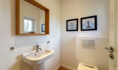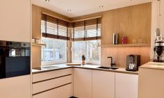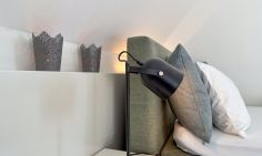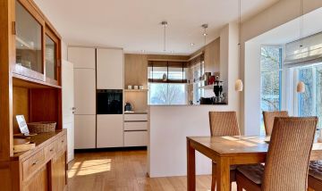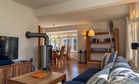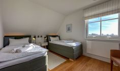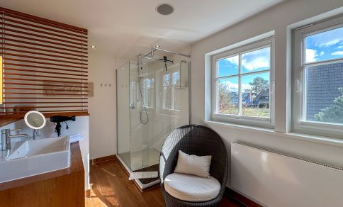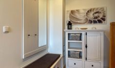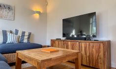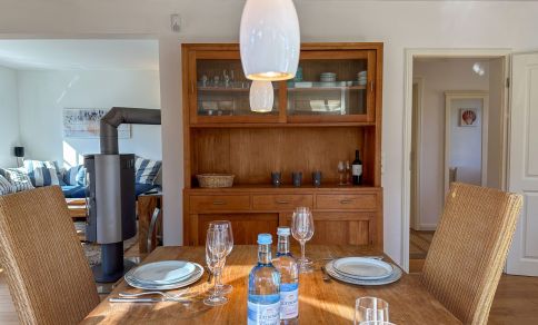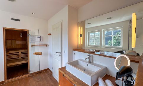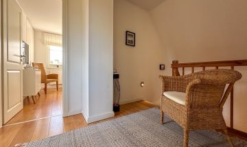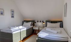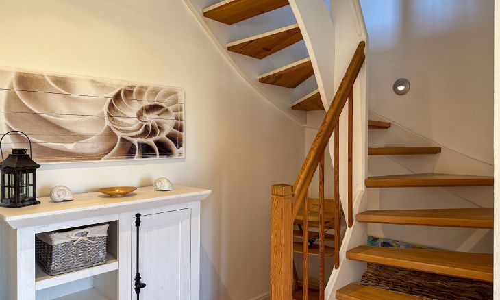 Das Erdgeschoss verfügt über einen offenen Wohnbereich mit einer gemütlichen Sitzecke am Kaminofen. Die modern und voll ausgestattete Küchenzeile mit Essplatz fügen sich unmittelbar ein und schaffen einen offenen und kommunikativen Wohncharakter. Hier ist alles vorhanden, was man sich für eine Küche wünscht - so macht das Kochen genauso Spaß wie zuhause. Auch ein Gäste-WC befindet sich auf der unteren Etage. Das Obergeschoss beherbergt ein gemütliches Hauptschlafzimmer mit hochwertigem Doppelbett sowie ein zweites Schlafzimmer mit zwei Einzelbetten. Das stylische Badezimmer mit Wellnessdusche als auch die hauseigene Sauna sorgen für einen weiteren traumhaften Wohnkomfort.