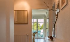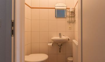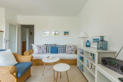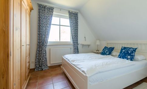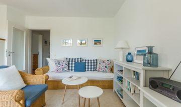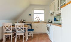 Die Ferienwohnung befindet sich im ersten Obergeschoss und ist über eine kurze Treppe zu erreichen. Lichtdurchflutete Räume und helle, freundliche Farben lassen sofort Urlaubsfeeling aufkommen. Der offene Wohn- und Küchenbereich ist Mittelpunkt der Wohnung. Mit seiner gemütlichen Sofagarnitur, dem Esstisch und der vollausgestatteten Küchenzeile kannst du hier nach Herzenslust klönen, kochen und entspannen. Die zwei Schlafzimmer sind harmonisch und geräumig gestaltet. Das Hauptschlafzimmer ist mit einem Doppelbett ausgestattet, ein zweites Schlafzimmer besitzt ein Kojenbett für eine dritte Person. Abgerundet wird der Wohnkomfort mit einem Badezimmer mit Dusche, WC und Waschmaschine sowie einem zweiten Gäste-WC.