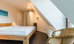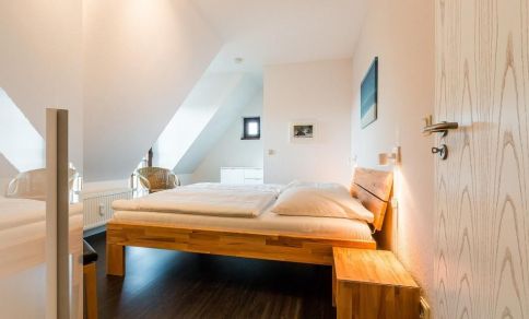 Im Erdgeschoss empfängt dich der Wohnraum mit einer modernen Leder-Sitzecke am Kaminofen. Der Essbereich ist im Erker integriert und die komplett ausgestattete Küchenzeile fügt sich harmonisch in den Wohnbereich ein und schafft so einen offenen Wohncharakter. Ein kleiner Flur und ein Gäste-WC finden ebenfalls in der unteren Etage Platz. Die Süd-West-Terrasse ist mit hochwertigen Teakholz-Gartenmöbeln ausgestattet und verspricht dir entspannte Stunden nach einem ereignisreichen Tag. Das Obergeschoss beherbergt ein Schlafzimmer mit einem Doppelbett sowie ein zweites Schlafzimmer mit drei Einzelbetten. Abgerundet wird das familienfreundliche Ferienhaus mit einem Tageslichtbad mit Dusche/WC.