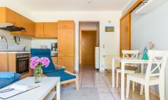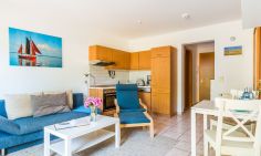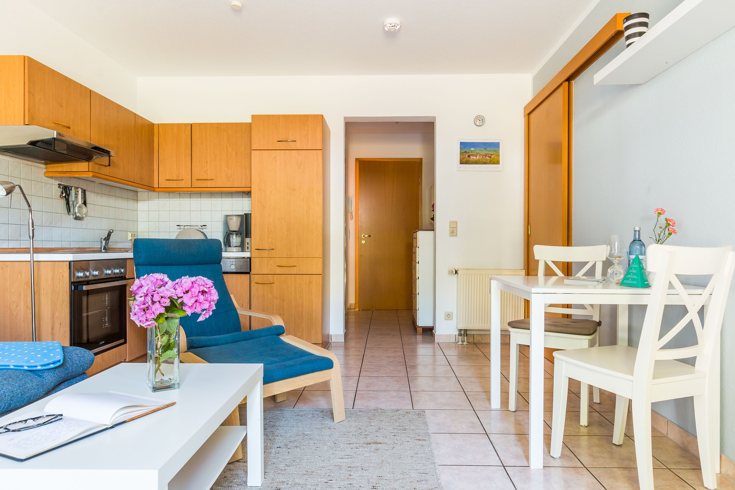 Die kleine Wohnung für max. 2 Personen liegt sehr schön, die Terrasse bietet einen schönen Blick über die großzügige Grünfläche der Anlage in den Abendhimmel. Allerdings funktionierte leider die Spülmaschine nicht und für einen längeren Aufenthalt wäre eine Waschmaschine sehr hilfreich. Die kleine Einbauküche ist etwas in die Jahre gekommen, die Sockelleisten bröseln bereits. Auch im Bad müssten die Fugen erneuert werden, hier schimmelt es im Bereich der Dusche. Leider war die Qualität der Reinigung bei Einzug nicht zufriedenstellend; viele Spuren der Vormieter mussten noch beseitigt werden. Trotzdem habe ich den Aufenthalt sehr geschätzt und mich wohlgefühlt.