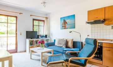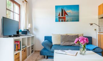 Mit dieser gemütlichen Ferienunterkunft bekommst du alles, was für den Urlaub zu zweit braucht. Mittelpunkt ist der offene Wohnraum mit Sitzeck und TV sowie integrierter kleinen Küchenzeile und Esstisch. Das Schlafzimmer ist mit einem Doppelbett ausgestattet. Abgerundet wird die Erdgeschosswohnung mit einem Bad mit Dusche/WC.