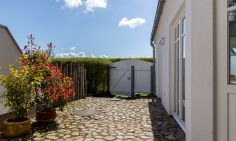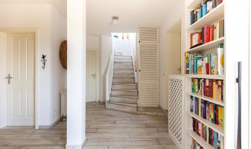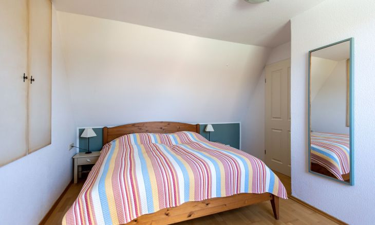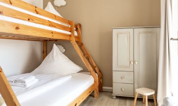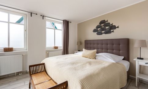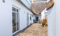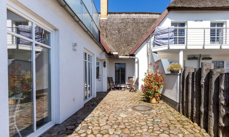 Die großzügige Doppelhaushälfte gehört zu den darßtypischen Reetdachhäusern, die so bekannt und beliebt für die Halbinsel sind. Schon bei Eintritt durch das große Holztor und den sonnigen Innenhof mit seinem alten Kopfsteinpflaster bekommt man Lust auf Urlaub. Im Erdgeschoss befindet sich die vollausgestattete Küche mit separatem Esszimmer. Der sonnige Platz an bodentiefen Fenstern biete sich bestens an, um gemeinsam zu essen, zu klönen und für ein gemütliches Beisammensein. Auch zwei der drei Schlafzimmer befinden sich hier. Eins verfügt über ein großes gemütliches Doppelbett, das andere über ein Etagenbett. Mit Kleiderschrank und Vorhängen bieten sie nicht nur Komfort, sondern auch einen heimeligen Rückzugsort. Abgerundet wird das Untergeschoss mit einem Gäste-WC und dem Tageslichtbad mit großer Regendusche.
