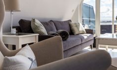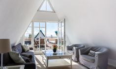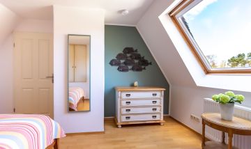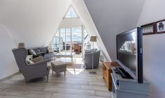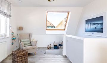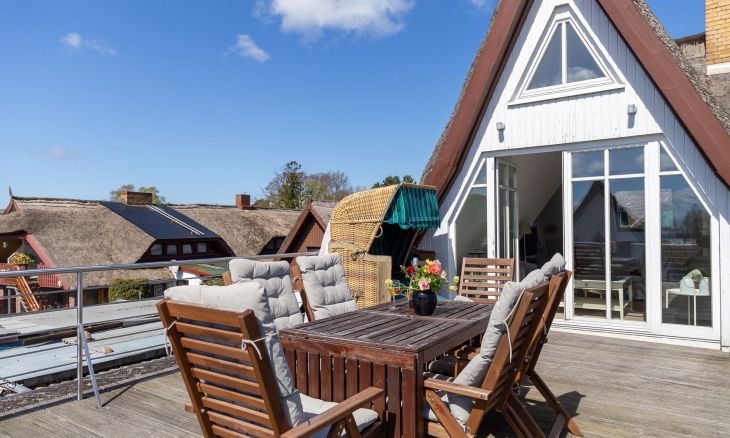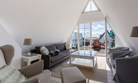 Über die Treppe gelangt man in das Obergeschoss und in das dritte Schlafzimmer. Der Wohnbereich befindet sich im Spitzdach und ist zweifelsohne das Highlight des Ferienhauses. Das lichtdurchflutete und in hellen Farben eingerichtete Wohnzimmer bietet bereits einen spektakulären Blick auf den Bodden. Noch beeindruckender ist dieser auf der angrenzenden Dachterrasse. Egal, ob im Strandkorb oder am großen Tisch – hier möchte man einfach nur sein! Denn nichts lässt einen mehr im Urlaub ankommen, als der weite Blick auf das Wasser, dass in der Sonne glitzert, eingerahmt von einer malerischen Landschaft. Wir übertreiben nicht, wenn wir sagen, dass es nicht viele Ferienhäuser in Wieck mit so einer besonderen Aussicht gibt.