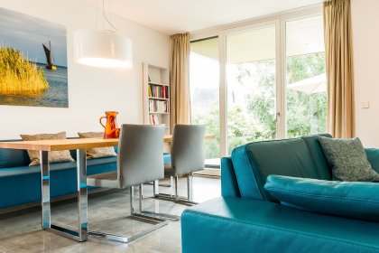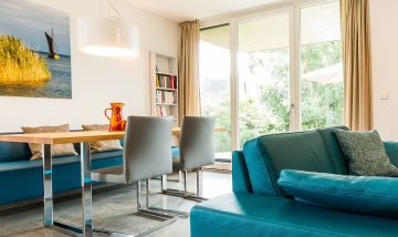 Die Unterkunft ist zentral in Wieck abseits jeglichen Verkehrs, d.h. absolut ruhig gelegen und erfüllt alle Wünsche. Es ist ausreichend Platz in der vollständig ausgestatteten Ferienwohnung mit Sauna. Wenige Meter entfernt kann man bei Bedarf ein Fahrrad ausleihen. Die Unterkunft ist sehr modern eingerichtet, der Blick vom Wohnbereich und der Terrasse aus geht ins Grüne. Es ist alles sehr stimmig.