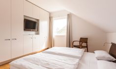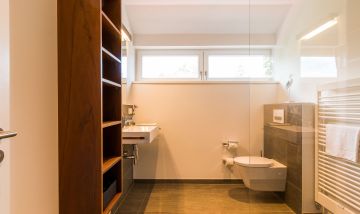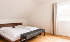 Im Zweienhaus trifft moderne Architektur auf eine stilvolle Innenausstattung. Dank des hochwertigen Interieurs lässt die Doppelhaushälfte keine Wünsche offen und ist Garant für einen rundum gelungenen Urlaub. Du gelangst über den großzügigen Eingangsbereich direkt in den modernen Wohnraum, der über eine hochwertige Ledersitzgruppe verfügt. Der lichtdurchflutete Essbereich mit wunderbarem Ausblick ins Grüne und ein Kaminofen fügen sich harmonisch ein. Weiterhin befindet sich im Erdgeschoss der offene und sehr gut ausgestattete Küchenbereich, der etwas vom Wohnbereich separiert ist. Ein Bad mit Dusche/WC und ein Hauswirtschaftsraum mit Waschtrockner sind ebenfalls auf dieser Etage untergebracht. Das Dachgeschoss beherbergt zwei Schlafzimmer, die jeweils mit einem Doppelbett und mit geräumigen Einbauschränken ausgestattet sind. Eines der beiden Schlafzimmer bietet ein zusätzliches TV-Gerät. Das Badezimmer mit Dusche/WC sowie ein kleiner Wellnessbereich mit eigener Sauna sorgen für Wohn- und Wohlfühlkomfort zu jeder Jahreszeit.