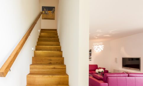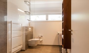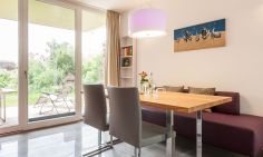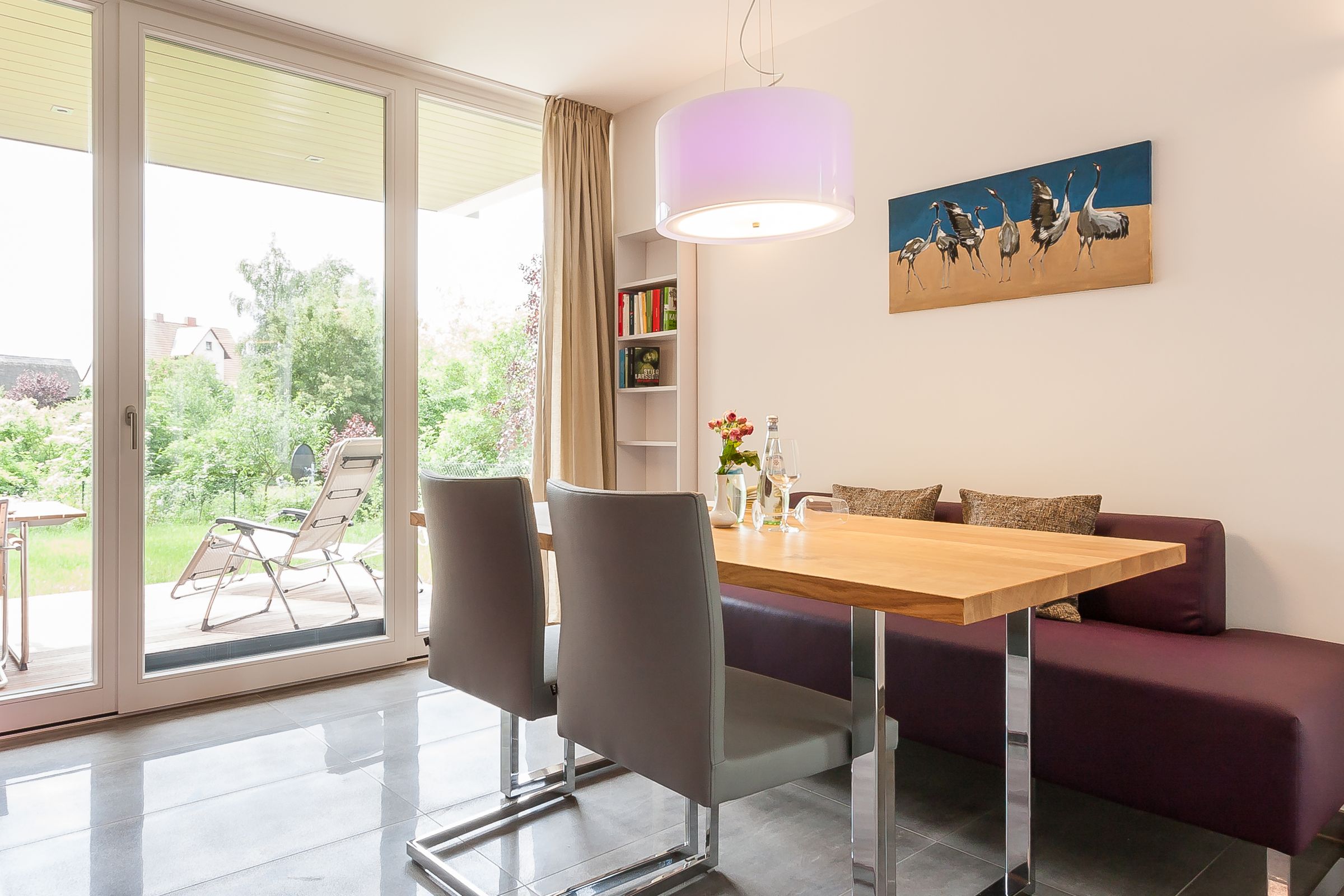 Im Zweienhaus trifft moderne Architektur auf eine stilvolle Innenausstattung. Dank des hochwertigen Interieurs lässt die Doppelhaushälfte keine Wünsche offen und ist Garant für einen rundum gelungenen Urlaub. Du gelangst über den großzügigen Eingangsbereich direkt in den modernen Wohnraum, der über eine hochwertige Ledersitzgruppe verfügt. Der lichtdurchflutete Essbereich mit wunderbarem Ausblick ins Grüne und ein Kaminofen fügen sich harmonisch ein. Weiterhin befindet sich im Erdgeschoss der offene und sehr gut ausgestattete Küchenbereich, der etwas vom Wohnbereich separiert ist. Ein Bad mit Dusche/WC und ein Hauswirtschaftsraum mit Waschtrockner sind ebenfalls auf dieser Etage untergebracht. Das Dachgeschoss beherbergt zwei Schlafzimmer, die jeweils mit einem Doppelbett und mit geräumigen Einbauschränken ausgestattet sind. Eines der beiden Schlafzimmer bietet ein zusätzliches TV-Gerät. Das Badezimmer mit Dusche/WC sowie ein kleiner Wellnessbereich mit eigener Sauna sorgen für Wohn- und Wohlfühlkomfort zu jeder Jahreszeit.